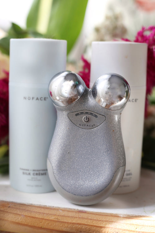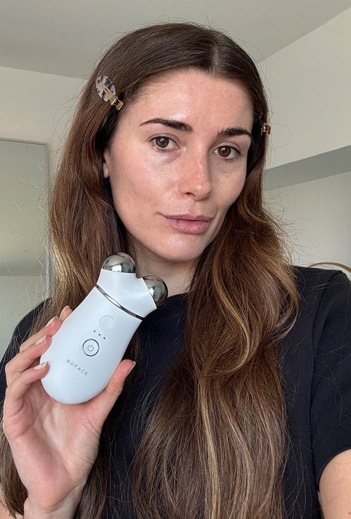 Turn on the NuFACE device and choose your desired intensity. Place the device against your skin and glide it slowly upward (for example, from the jawline to the cheekbone or from the eyebrow toward the hairline). Hold for a few seconds per area and follow the natural muscle lines of the face.
